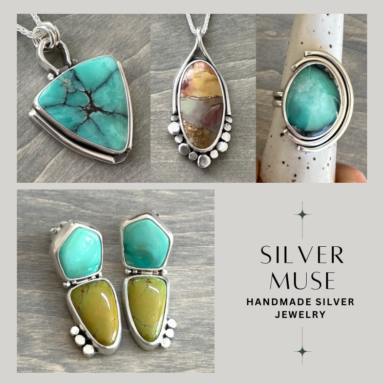 Hand fabricated sterling silver jewelry with genuine turquoise, variscite, and jasper stones.