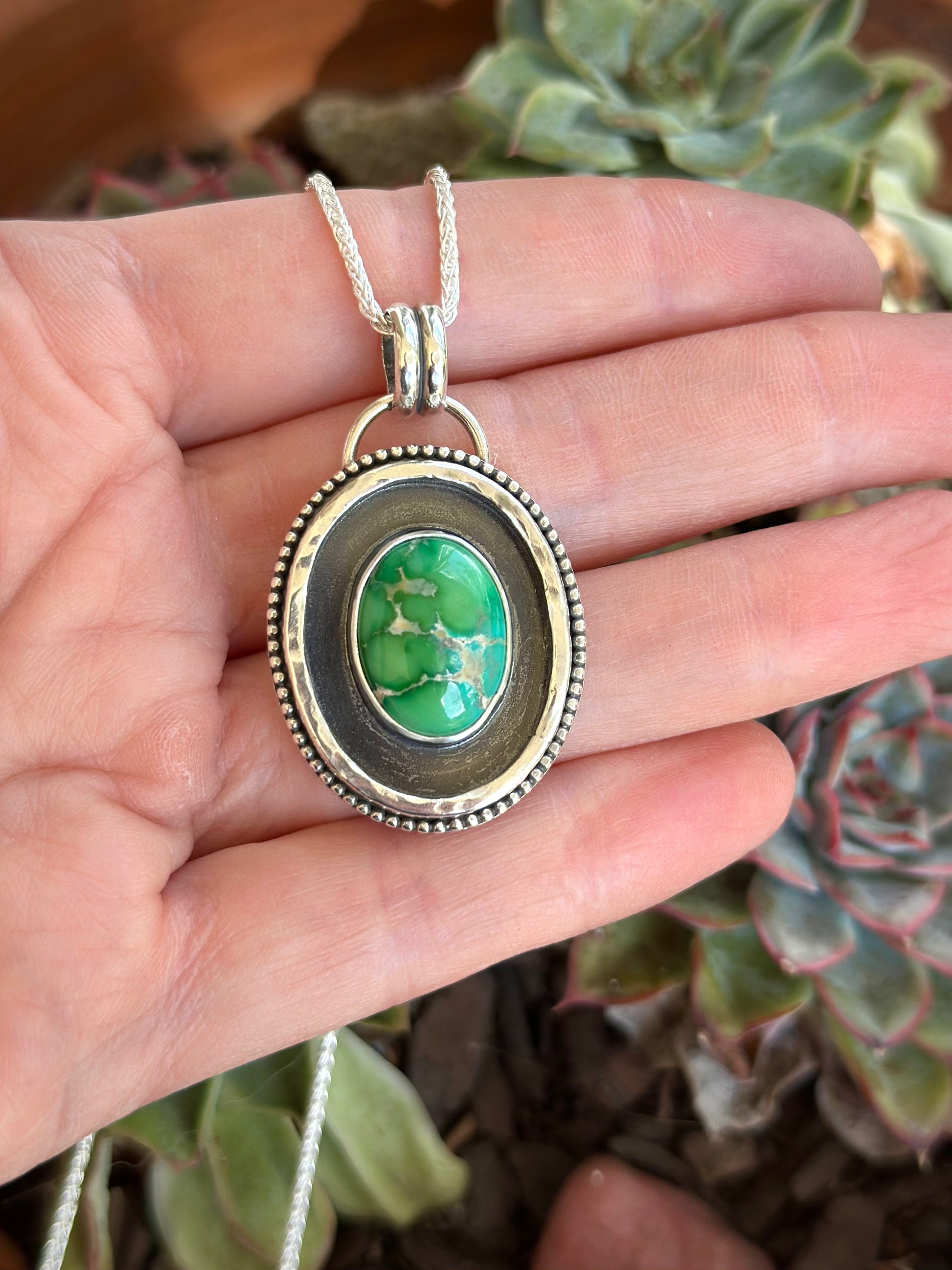 Emerald Valley Turquoise, set in a sterling silver shadowbox setting. The edge of the shadowbox has also been lightly stamped.