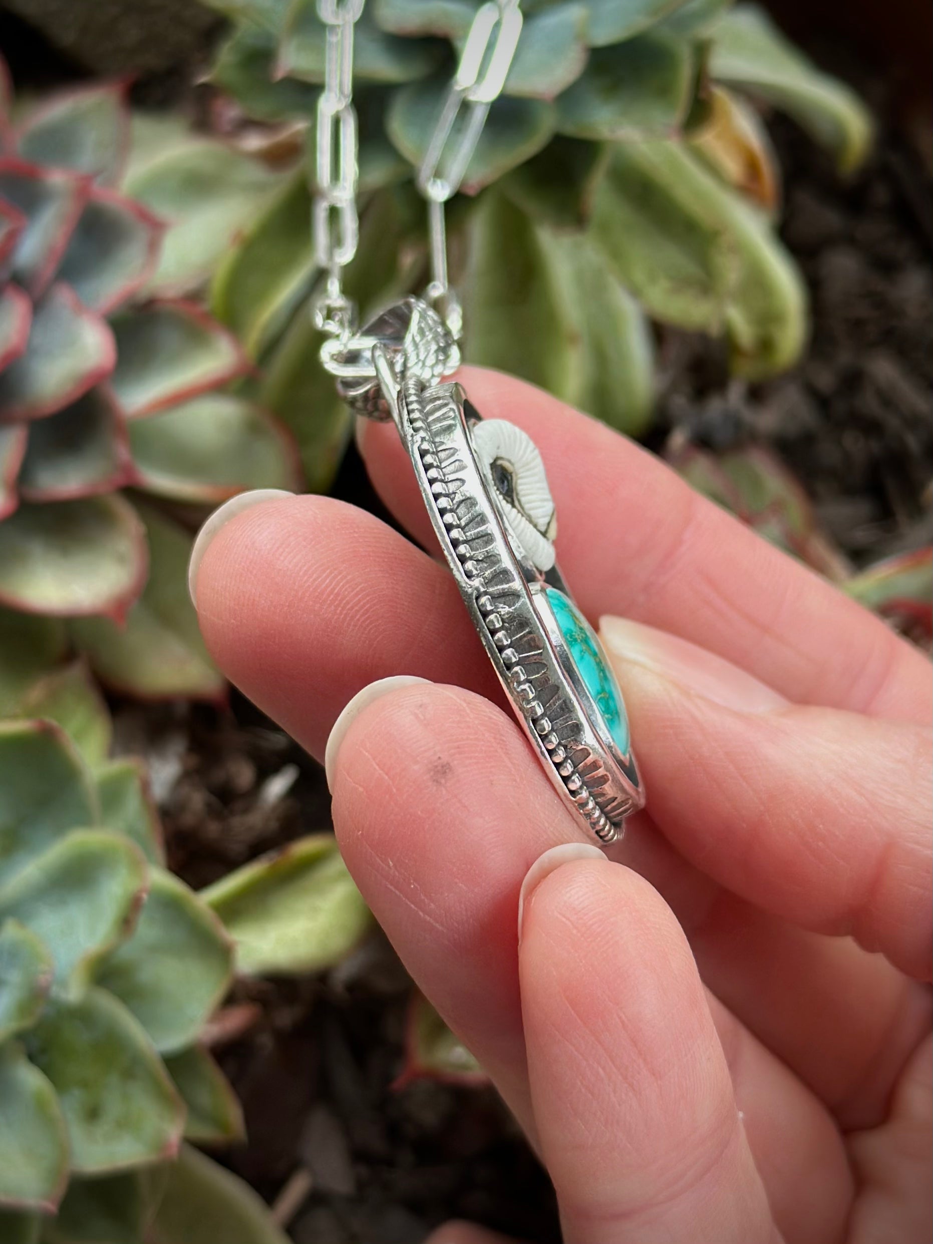 A hand painted porcelain Laura Mears owl face surrounded by a shadowbox style sterling silver border and paired with Natural Fox Turquoise. It has a stamped edge along the side of the shadowbox.