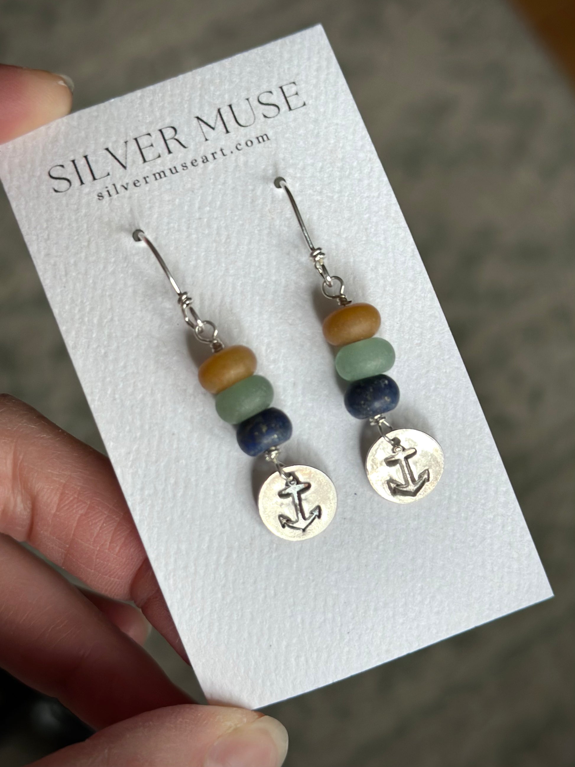 Gemstone beads atop fine silver stamped anchors. Sterling silver shepherd hook earwires. Total length is 2 inches.