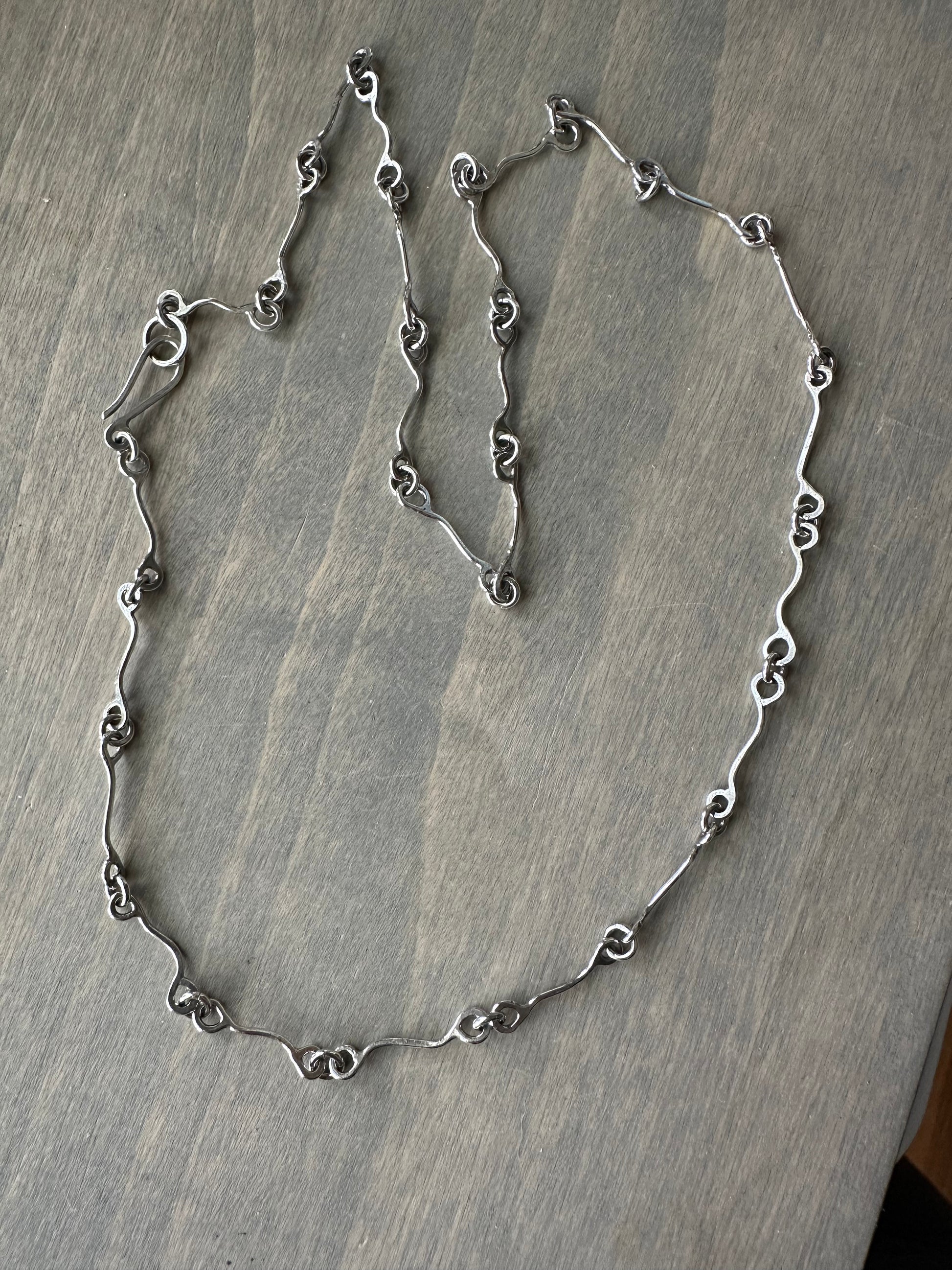 Handmade fine silver hammered and oxidized ‘bone’ links with sterling silver connecting jumprings, plus a fine silver hook and loop closure. Available in 21 and 22 inch lengths. These can hold one of my pendants with the larger bails.
