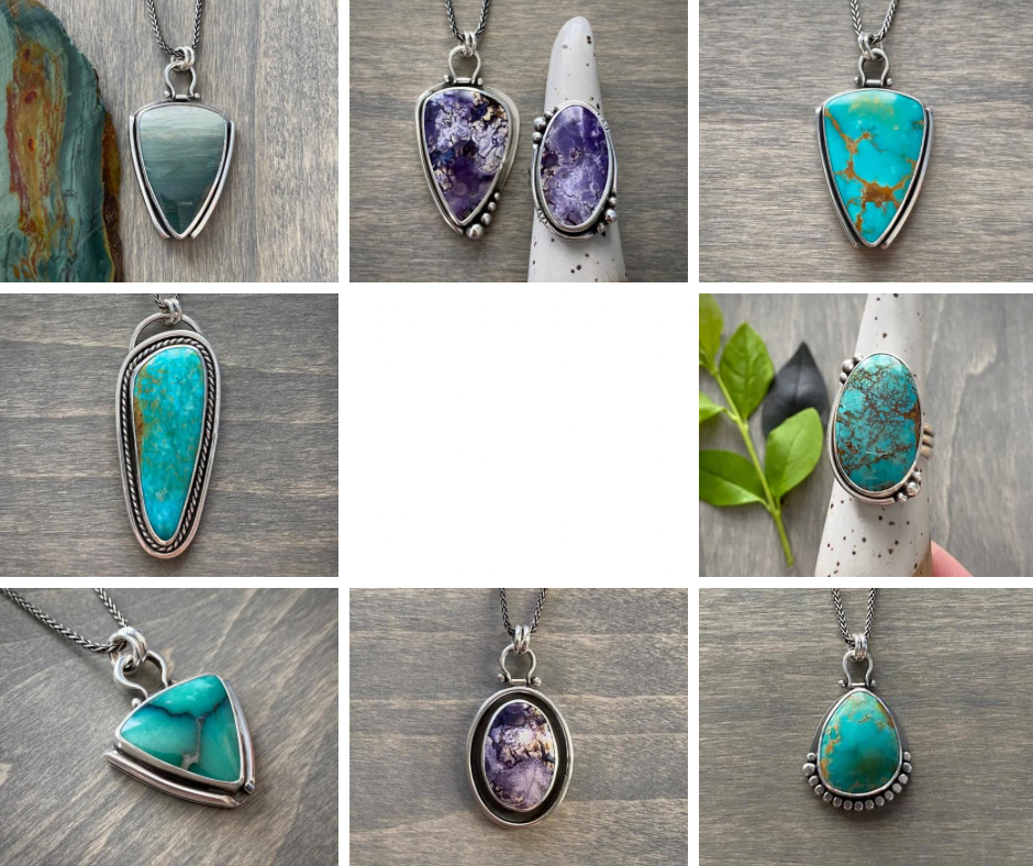 Hand fabricated sterling silver jewelry with genuine turquoise, variscite, and jasper stones.